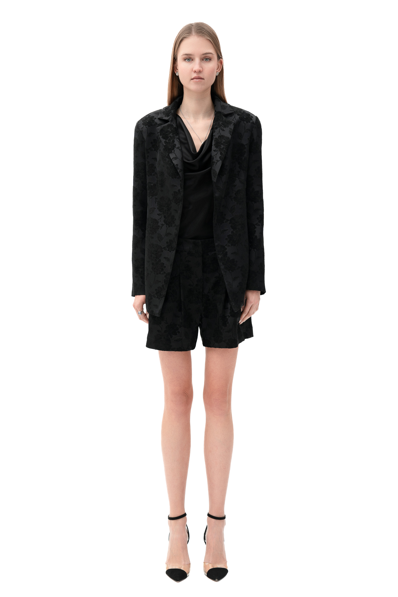 Elevate your formal wardrobe with the Jacquard Blazer in Black. Featuring an intricate jacquard pattern and tailored design, this blazer exudes elegance and sophistication, perfect for any occasion where style meets class.