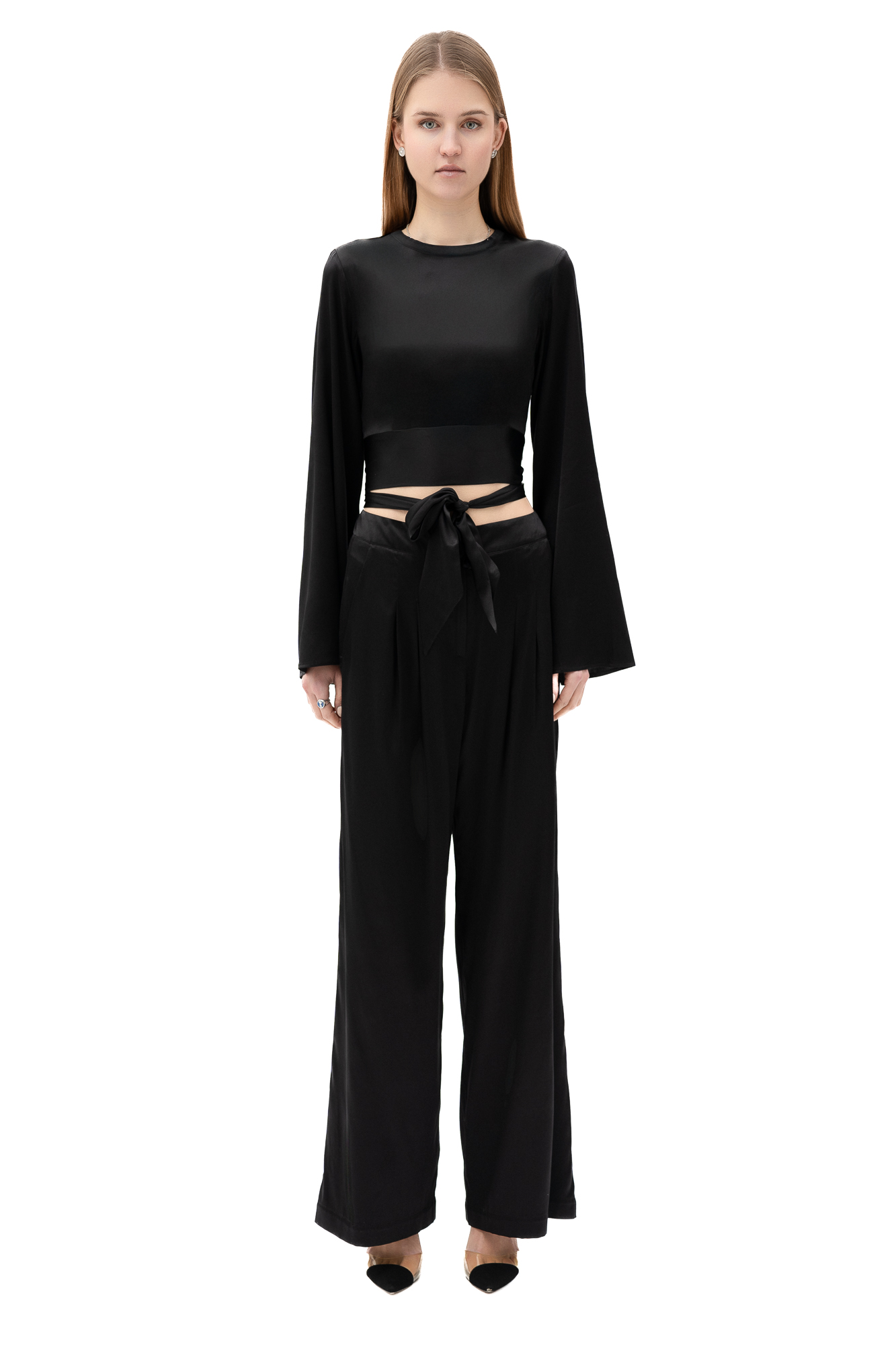 Redefine elegance with the Silk High-Waisted Trousers in Black. These versatile trousers feature a timeless design and a luxurious feel, making them the perfect addition to your wardrobe.