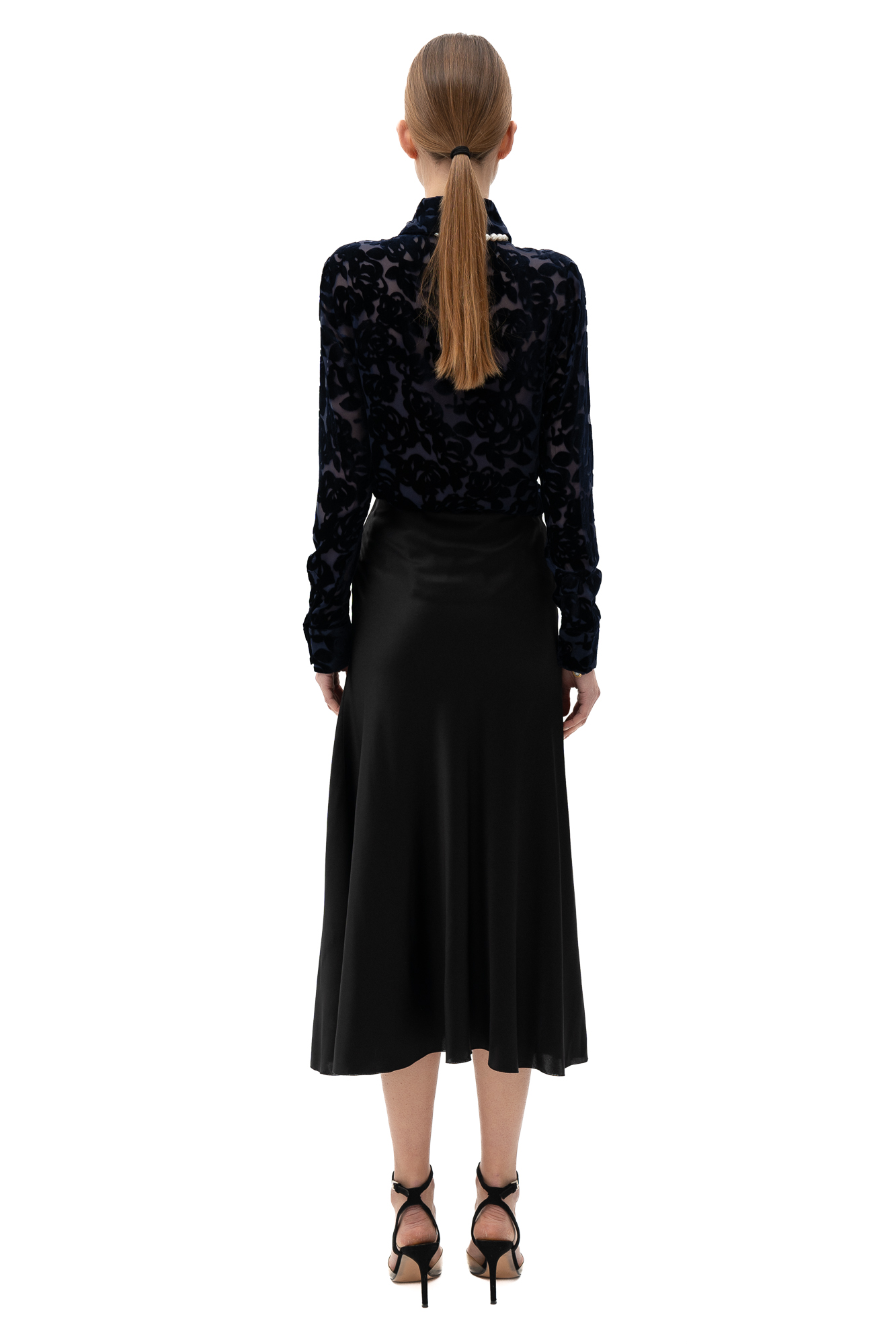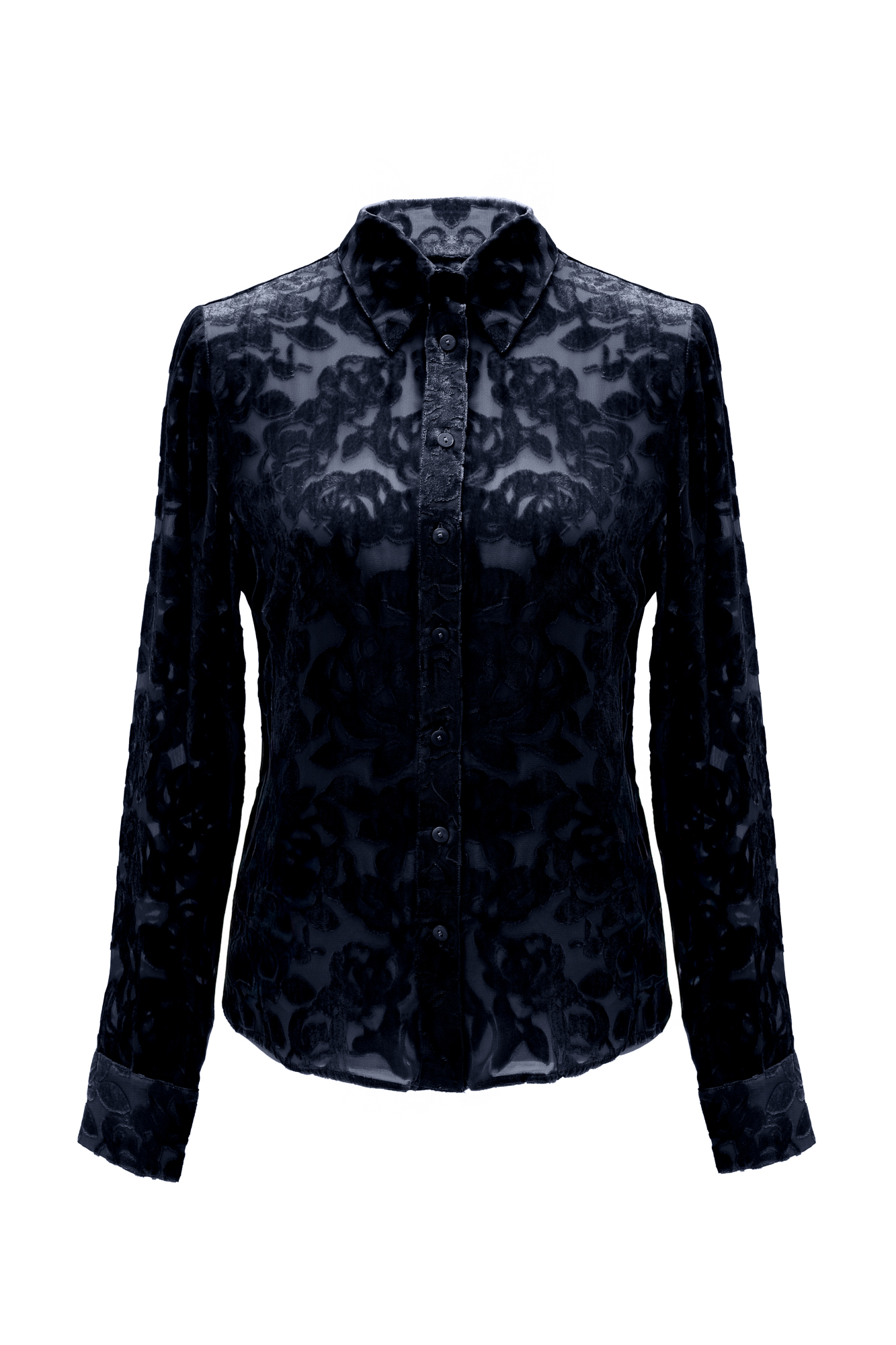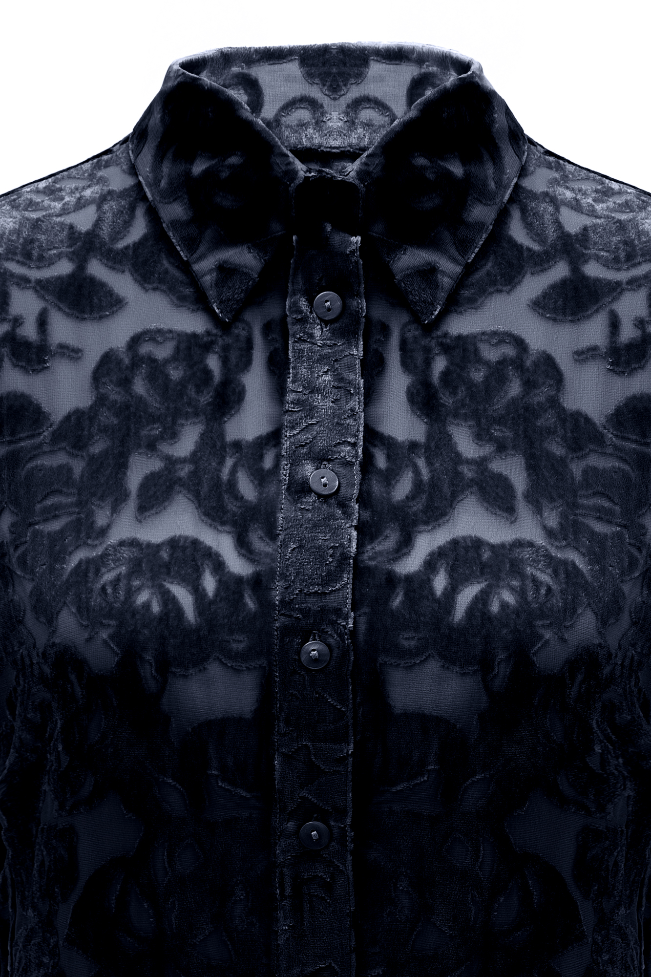 Introduce a touch of mystery and elegance to your wardrobe with the Velvet Burnout Semi Sheer Shirt in Midnight Blue. The semi-sheer texture and intricate velvet burnout pattern make it a standout piece for any occasion.