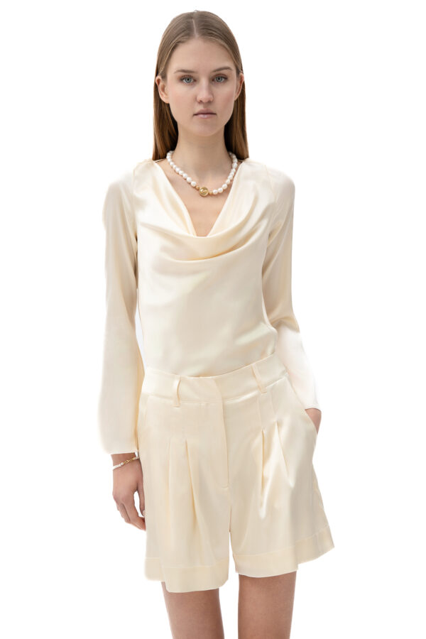 Elevate your style with the Silk Cowl Neck Blouse in Cream. Featuring a delicately draped neckline and a stunning open-back design with tie detailing, this blouse brings effortless elegance and a touch of allure to any outfit.