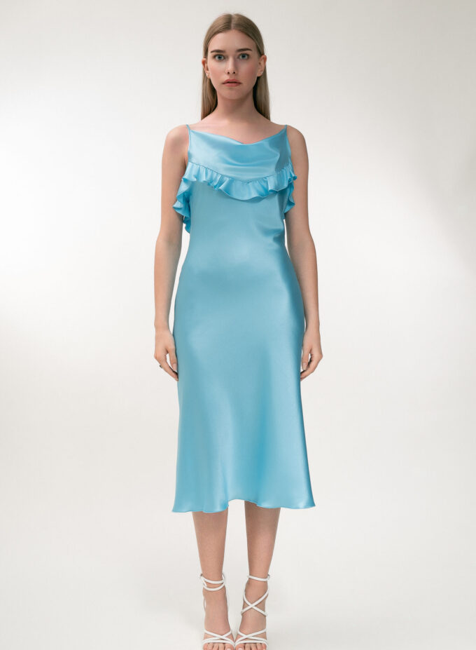 Silk Midi Dress with Ruffle Detail In Turquoise