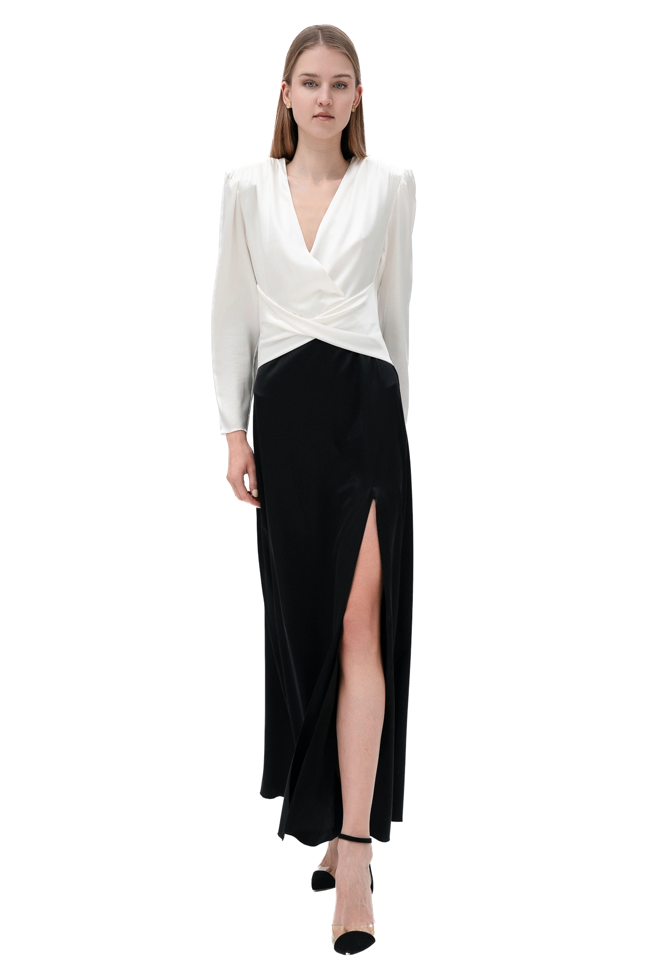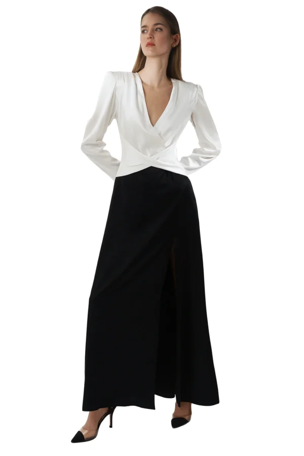 Elevate your wardrobe with the Silk Monochrome Cinched Waist Long Dress. Crafted from premium silk, this dress combines timeless sophistication with a contemporary edge. The cinched waist accentuates your figure, while the thigh-high slit adds a touch of effortless allure, perfect for any elegant occasion.
