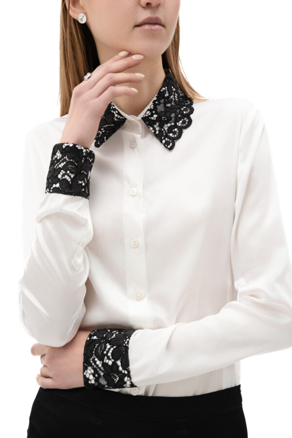 Indulge in understated elegance with the Silk Shirt with Black Lace Details in White. Crafted from premium silk, this timeless piece combines classic sophistication with a modern twist, featuring intricate black lace accents on the collar and cuffs.